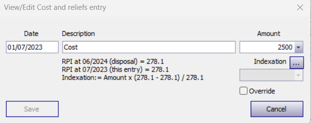 As you make these entries indexation relief is automatically calculated. Checking the Override tick box enables manual changes to the indexation figure.