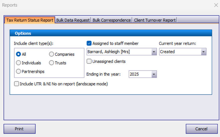 Click on one of the All, Individuals, Partnerships or Companies radio buttons to select the client type for whom you wish to produce a report and hit the Print button.